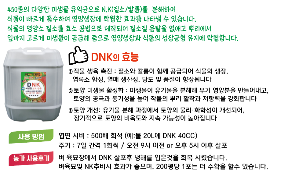 450종의 다양한 유익균으로 N.K(질소/칼륨) 분해하여 미생물 2차대사산물효소제 입니다.식물에게 각종 영양공급 촉진과