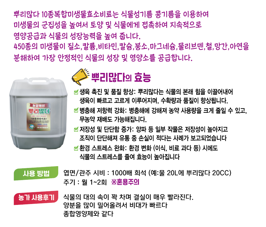 450종의 미생물이 질소, 칼륨, 비타민, 칼슘, 붕소, 마그네슘, 몰리브덴, 철,