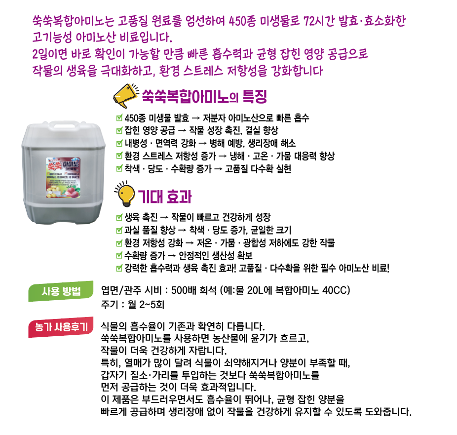 숙기 촉진 효과에 탁월하며 건강한 생육과 수확량 증대 및 색택이 선명해 집니다