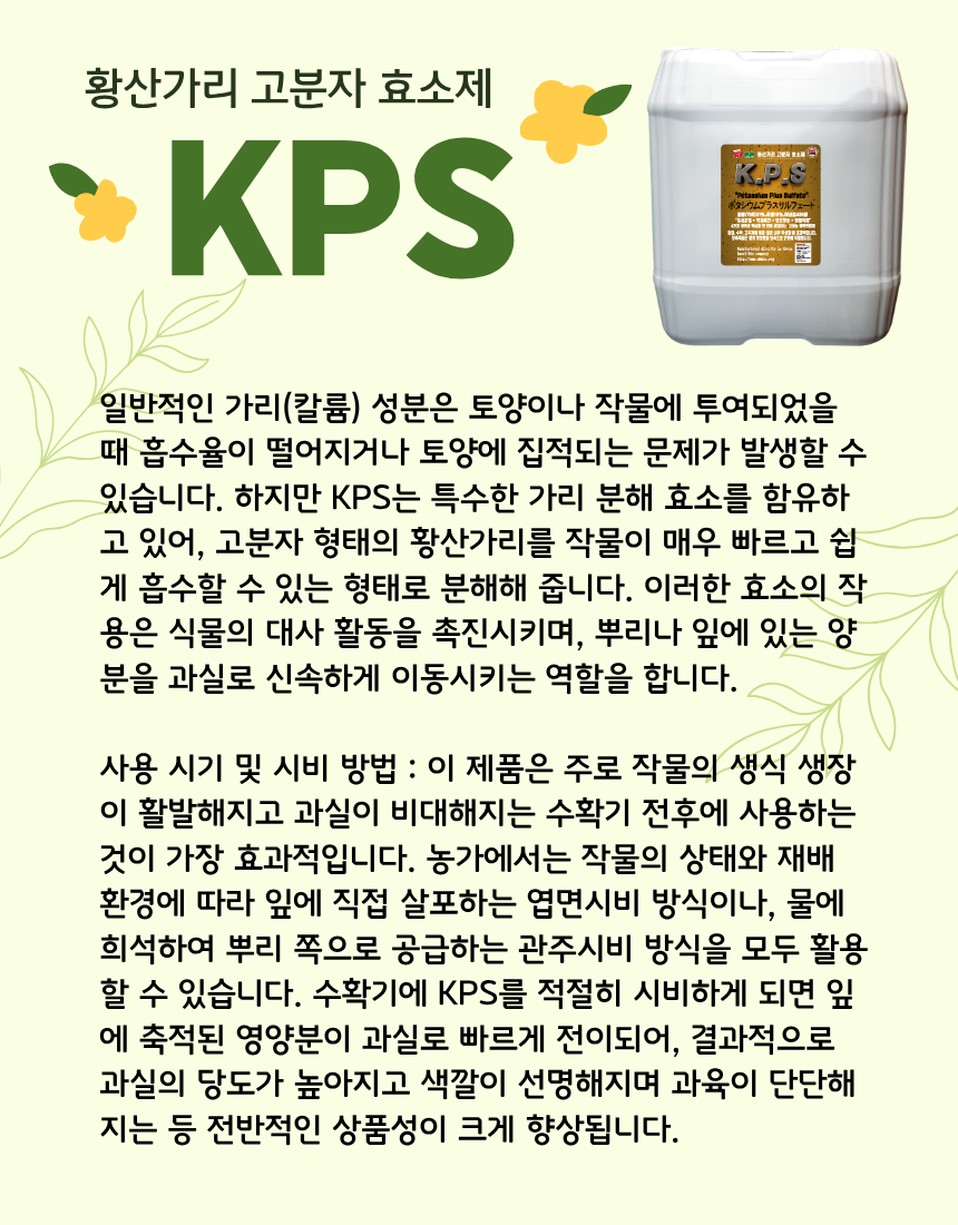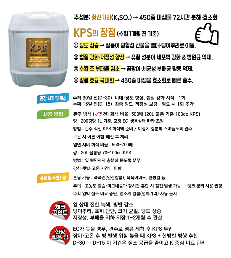 KPS(가리(칼륨) 분해효소로 수확기 옆면또는 관주시비 잎에있는 영양분을 모두 열매로 보내줍니다. )